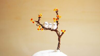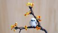 小鳥 ゴジュウカラ 小花をくわえた体長約2cmのゴジュウカラが木にとまっていますとても小さいですが、くちばしも上下に分かれていて、しっかりと小花を挟んでいます周りに咲いているお花は粘土等でできていますゴジュウカラは、和紙、粘土などでできています 小鳥